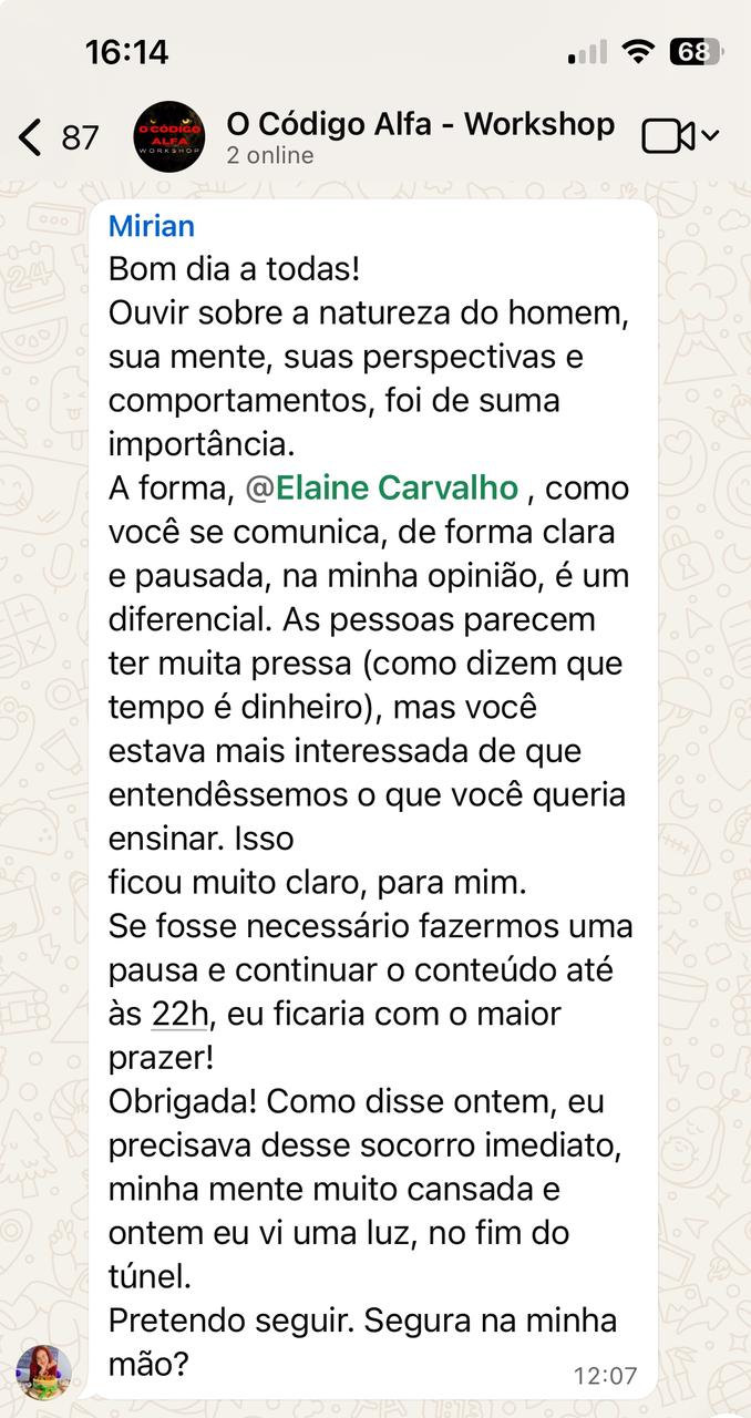 Você pode conseguir uma chance de tirar suas dúvidas pessoais com a Elaine adquirindo a área VIP no ato da compra. Ao final do Workshop a Elaine fica com as mulheres da área VIP para uma mentoria pessoal. É uma experiência de aprendizado única através da vivência de outras mulheres.