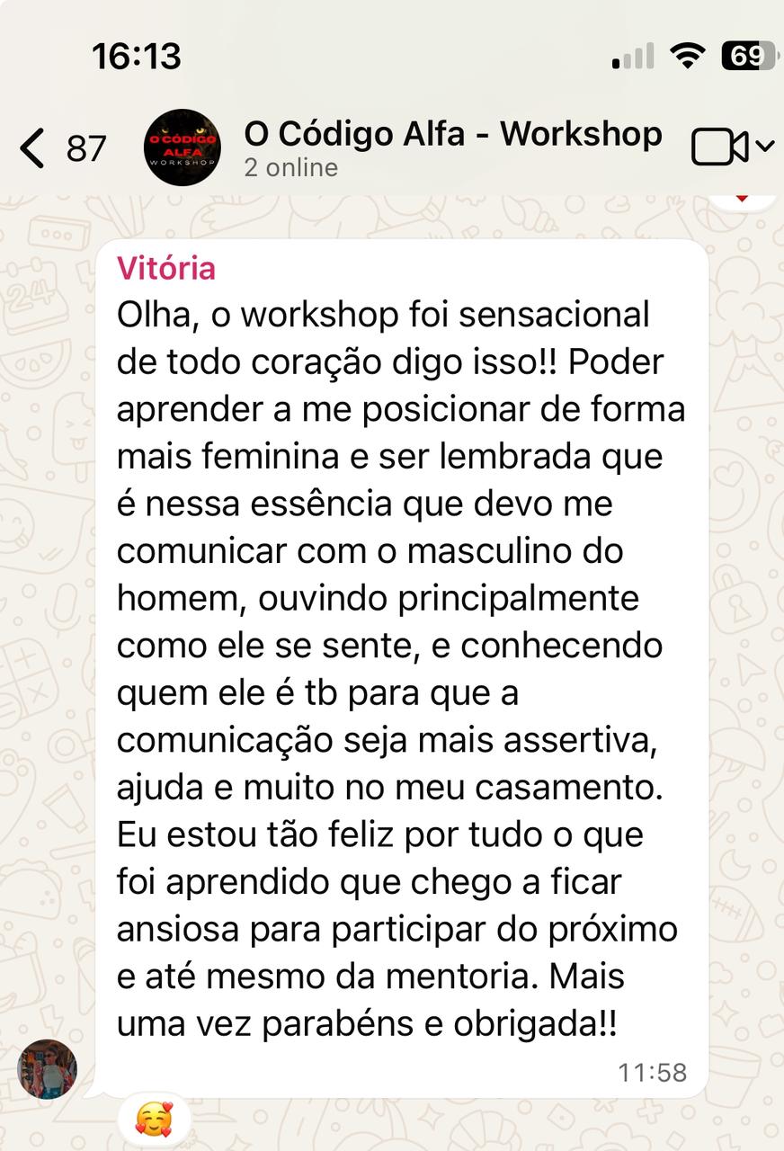 Há 2 anos mentoro mulheres que estavam exatamente onde eu estava. E os resultados são reais: relacionamentos transformados, mulheres finalmente entendendo o que estavam fazendo de errado, ciclos destrutivos sendo quebrados.
